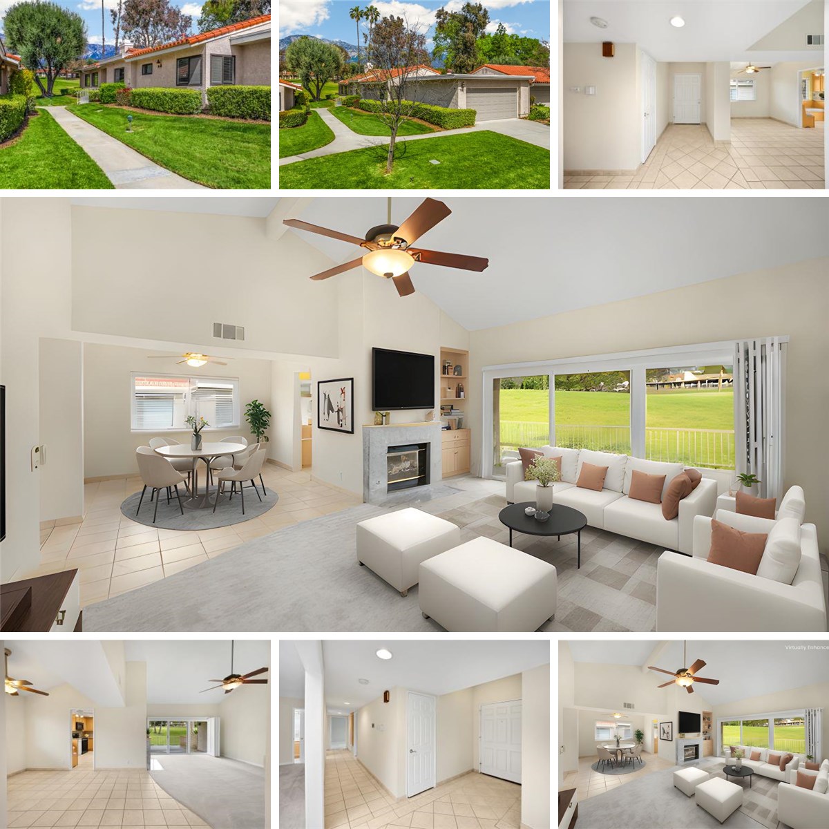 Spectacular Views & Resort Living on the 1st Hole! Welcome to effortless living in this beautifully updated single-story end unit, perfectly positioned inside the gated Upland Hills Country Club. Enjoy stunning views of the 1st hole and the majestic San Gabriel Mountains right from your patio! Step inside to fresh Whisper Grey tones, soaring vaulted ceilings, and an airy open layout filled with natural light. The home features three bedrooms, one being used as a flex/office or guest room, and two tastefully upgraded bathrooms designed with comfort in mind. The remodeled kitchen offers modern appliances, a cozy breakfast nook, and easy access to your private patio—perfect for relaxing mornings or sunset dining with a view. Located just minutes from shopping, dining, and major freeways, this move-in ready gem offers resort-style living in one of Upland’s most desirable communities. Don’t miss the chance to make this picture-perfect home yours!