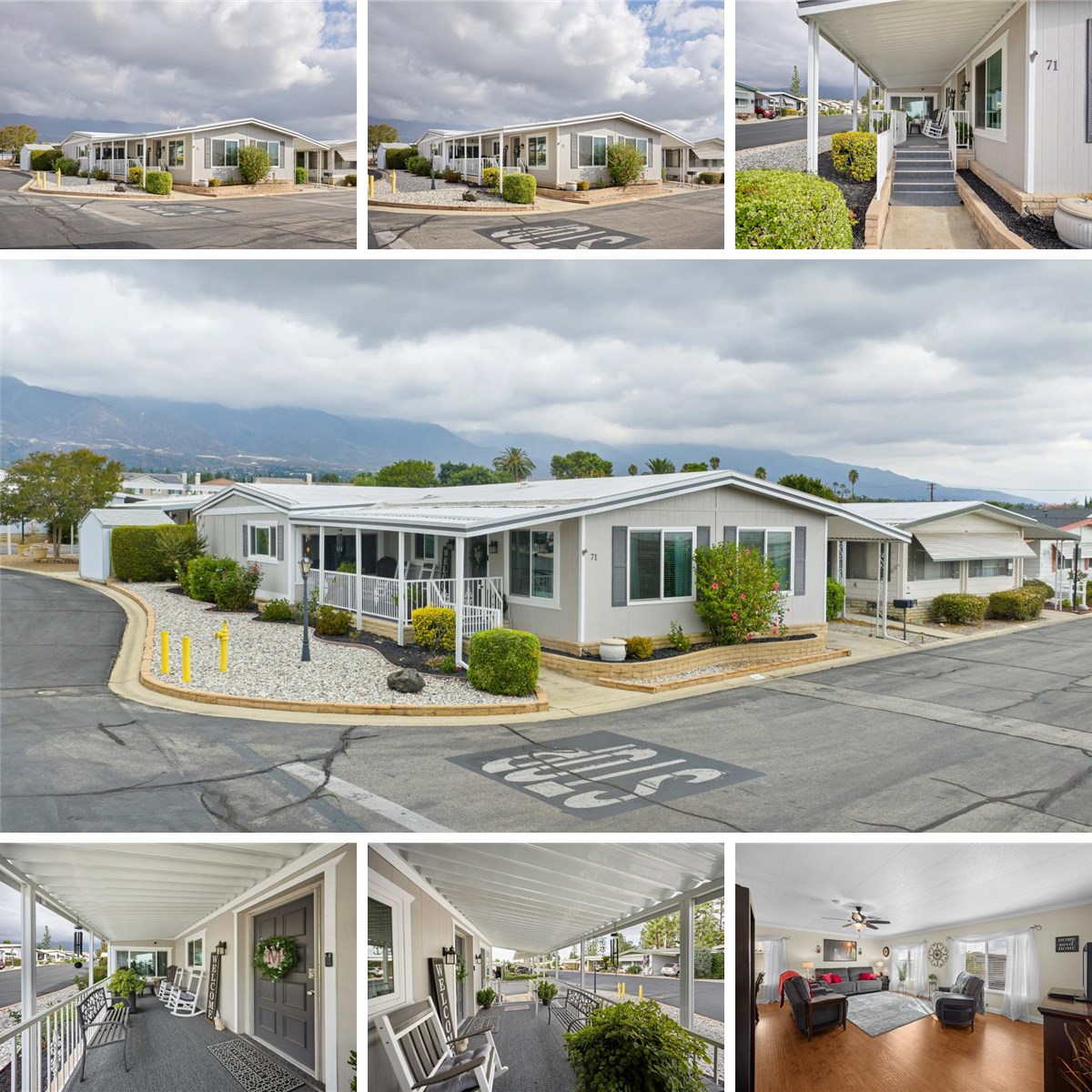 Location, Location, Location. Welcome to Ramona Villa Estates, A Highly Desired 55+ Community. Pride of ownership shines through this wonderful two-bedroom, two-bath manufactured home. This well maintained home offeris approximately 1,440 sq. ft of living space on a desirable corner lot with stunning mountain views. From the moment you arrive, you'll notice the thoughtful updates that make this home move-in ready. Extensive improvements provide lasting value and peace of mind, including: professional leveling with 36 new foundation support piers, energy efficient dual pane windows, a new reinforced front porch with outdoor carpeting and updated entry stairs at front and rear of home. Exterior paint and refreshed landscaping within the last 3 years. Step inside to high ceilings and an inviting open floor plan, featuring a spacious formal living and dining rooms with built in cabinetry and laminate flooring. The kitchen opens up to a spacious living area that features built-in book shelves with two desk/work areas. The kitchen offers corian countertops and an electric cooktop stove, blending style with functionality. The primary suite includes two walk-in closets, currently being used as a quilting/craft room. The adjacent primary bathroom has a large soaking tub and separate shower. A well appointed guest bedroom is located near a full bath with shower, providing comfort for visitors. Additional highlights include indoor laundry room with closet that can be used as an additional pantry and/or storage space. Note: Square footage is estimated at 1,440 sq. ft. A previous owner completed an addition. Buyer and Buyer's Agent to verify all information and conduct due diligence. This home is a rare find in one of the area's most desirable senior communities. Schedule your showing today. Please note, park approval is required.